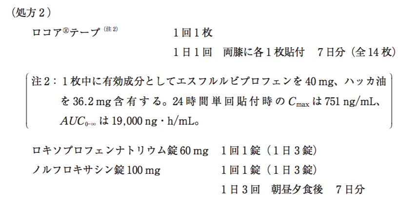 外来診察時に患者より、「痛みが治まらず、もっと効く薬が欲しい。」と訴えがあり、以下の処方2に変更された。