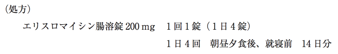 9歳男児。体重26kg。咳を伴う40℃近くの発熱が2日間続いた。近医を受診し、アセトアミノフェン錠とセフカペンピボキシル塩酸塩錠が5日分処方された。3日間経過しても解熱傾向が見られず、夜も眠れないほどの乾いた咳が続いているため、総合病院に紹介され入院治療を行うことになった。喀痰のグラム染色で陽性菌も陰性菌も同定されなかった。胸部レントゲン検査で多発性のすりガラス状陰影を認めた。セフカペンピボキシル塩酸塩錠を中止し、以下の処方を開始した。