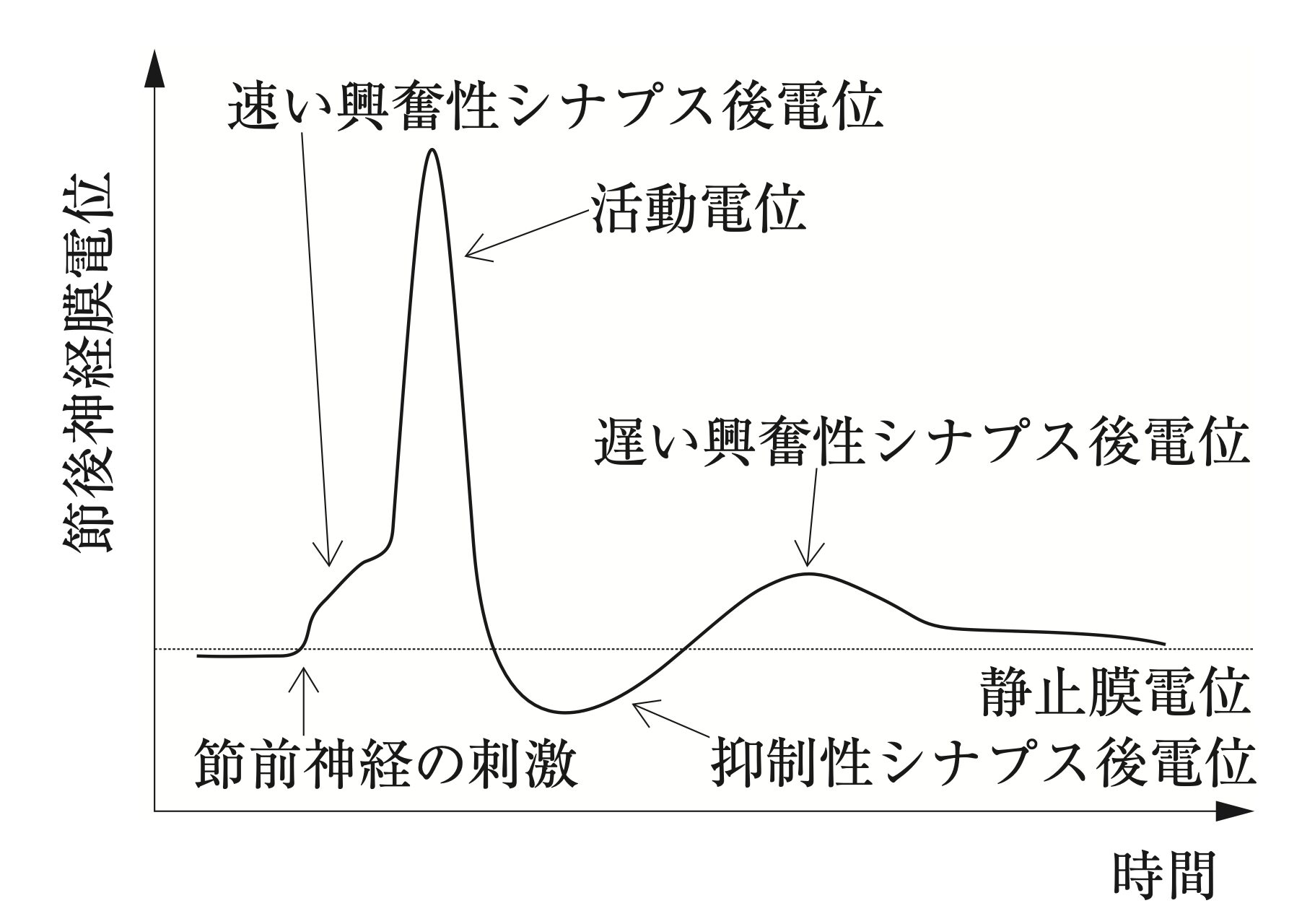 図は自律神経節における節後線維の細胞体の膜電位変化を示す。速い興奮性シナプス後電位に関わるのはどれか。1つ選べ。