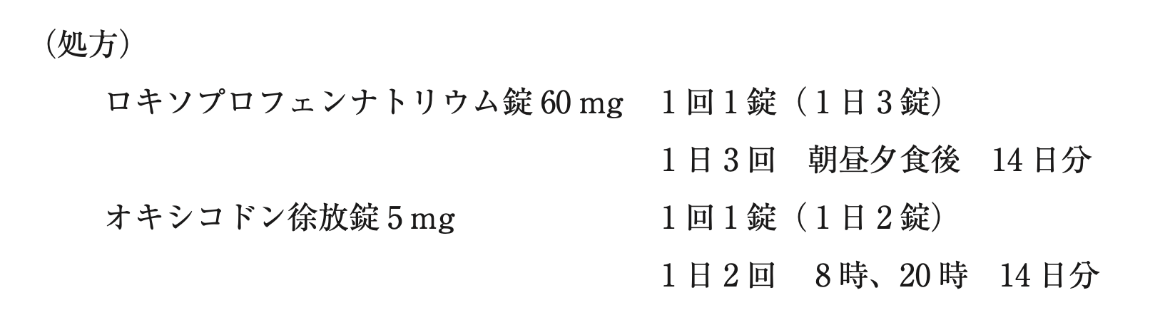 58歳女性。左乳がんと診断され、摘出術を受けた後、AC(ドキソルビシン塩酸塩+シクロホスファミド水和物)療法4コースが施行された。 1年後に再発、転移が確認されたため、週1回のパクリタキセルを用いた治療の導入のため入院し、 2コース目からは外来にて治療継続となった。再発時から切られるような鋭い強い痛みが出現しており、患者の希望により以下の鎮痛薬が処方されている。肝、腎機能は正常である。