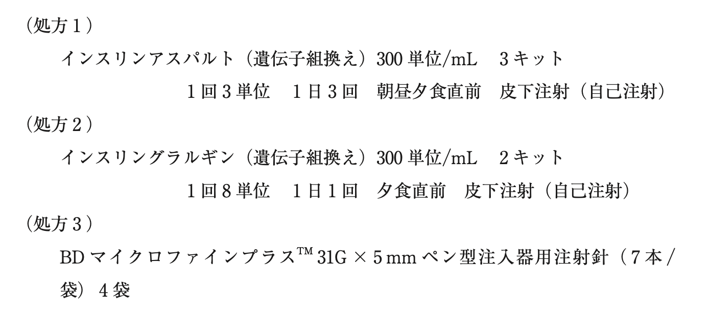 インスリンアスパルト(遺伝子組換え)の総単位は、300単位/キット×3キット=900単位であり、1回3単位使用することから空打ちを含めて1回5単位使用する。よって、インスリンアスパルト(遺伝子組換え)の総使用回数は180回となる。