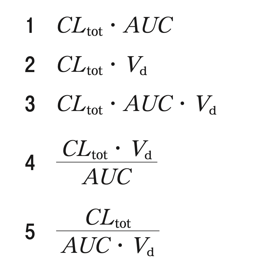 体内動態が線形1−コンパートメントモデルに従う薬物について、静脈内投与時の投与量に等しいのはどれか。1つ選べ。ただし、このときの血中濃度時間曲線下面積をAUCとし、全身クリアランスはCLtot、分布容積はVdとする。