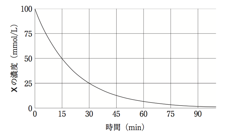 - Xの濃度が初濃度の1/2になるまでにかかる時間は、Yの濃度が100mmol/Lから150mmol/Lになるまでにかかる時間と等しい。
