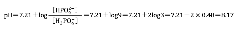 0.100mol/Lリン酸二水素一ナトリウム水溶液10.00mLに0.100mol/L水酸化ナトリウム水溶液を9.00 mL 加えると、リン酸二水素イオン(H2PO4)とリン酸水素イオン(HPO42-)が1:9で存在する状態となるため、ヘンダーソン・ハッセルバルヒの式よりpHを計算することができる。
