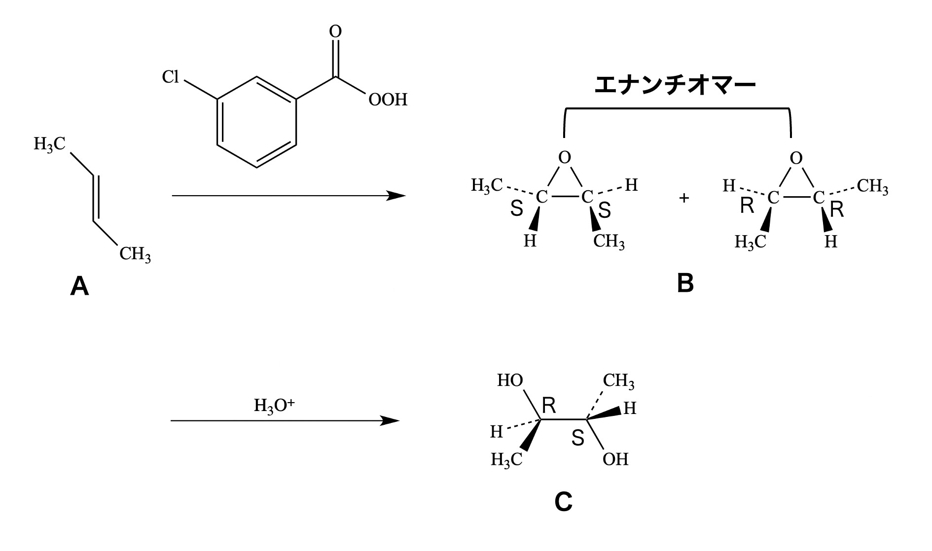 trans-ブタ-2-エン(A)にm-クロロ過安息香酸(mCPBA)を反応させることで生じる(2S,3S)–2,3-ジメチルオキシランと(2R,3R)-2,3-ジメチルオキシランは、エナンチオマーの関係にある。trans-ブタ-2-エン(A)にm-クロロ過安息香酸(mCPBA)を反応させと、それらが等量生成されるため、Bはラセミ体である。