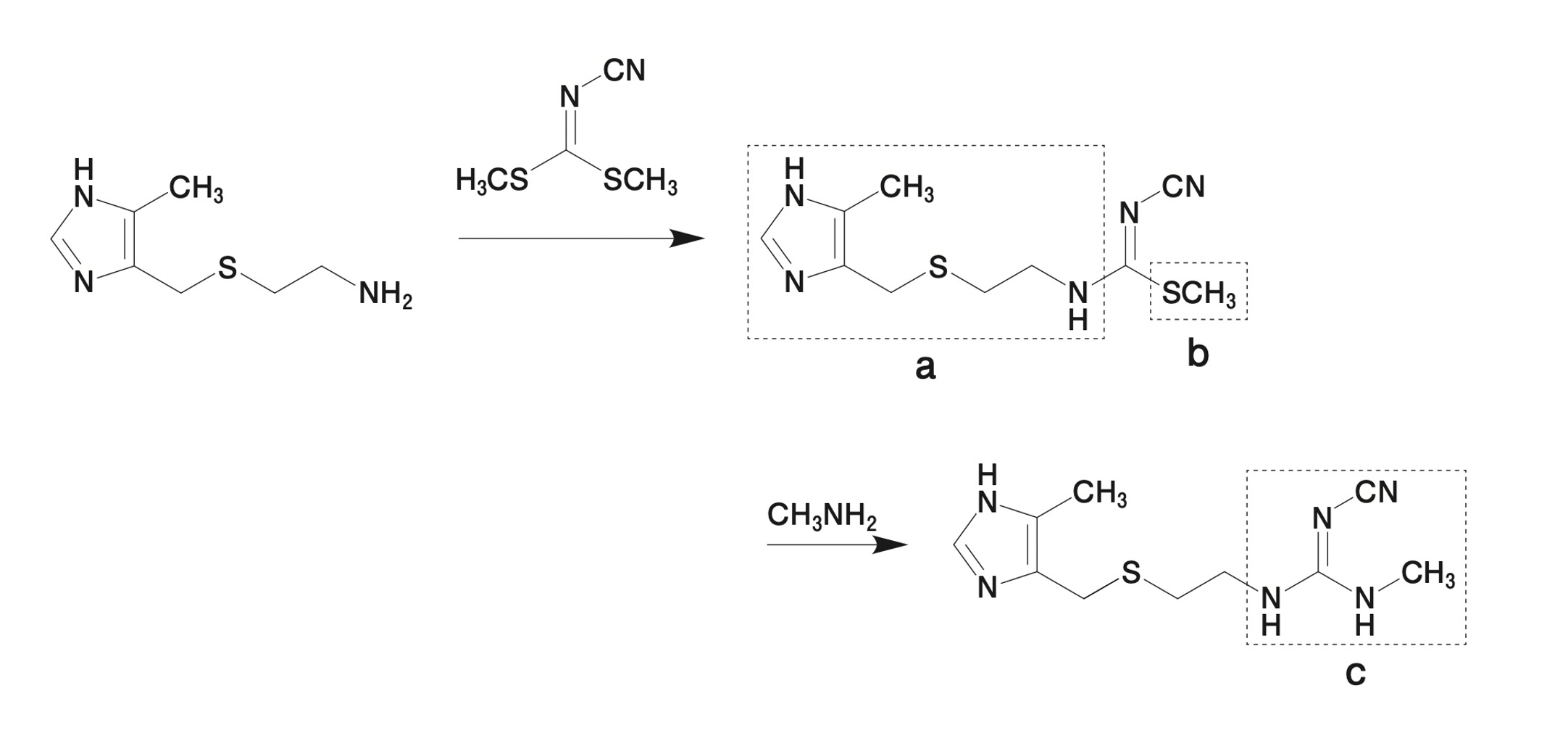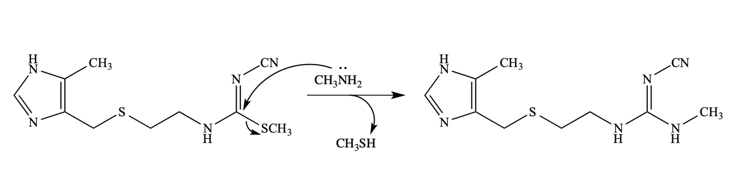 本反応では、N-シアノイミン(=C=N-CN)のイミンの炭素は、部分正電荷を帯びており、CH3NH2(メチルアミン)の窒素がイミンの炭素と結合しているため、CH3NH2は求核剤として働いている。