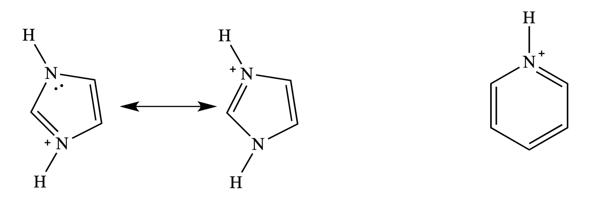イミダゾールは、芳香族複素環であり、3位の窒素の非共有電子対がsp2混成軌道に収容されていることから塩基性を示す。また、ピリジンも芳香族複素環であり、窒素の非共有電子対がsp2混成軌道に収容されていることから塩基性を示す。一般に、共役酸が安定なほど塩基性が強い。イミダゾールの共役酸は、共鳴により安定となる。そのため、イミダゾールはピリジンよりも強い塩基である。