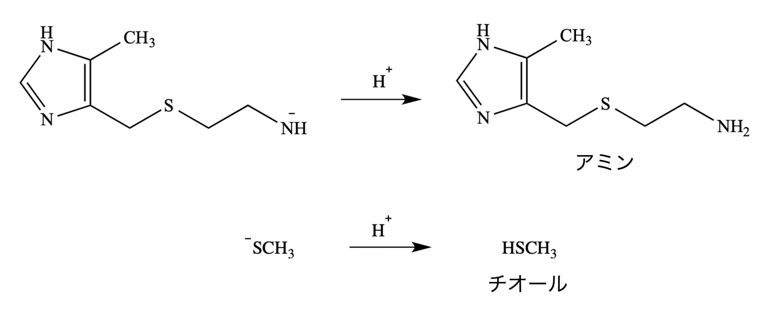 部分構造aが脱離して生じるアニオンは、アミドイオンであり、その共役酸はアミンとなる。部分構造bが脱離して生じるアニオンは、チオラートイオンであり、その共役酸はチオールとなる。