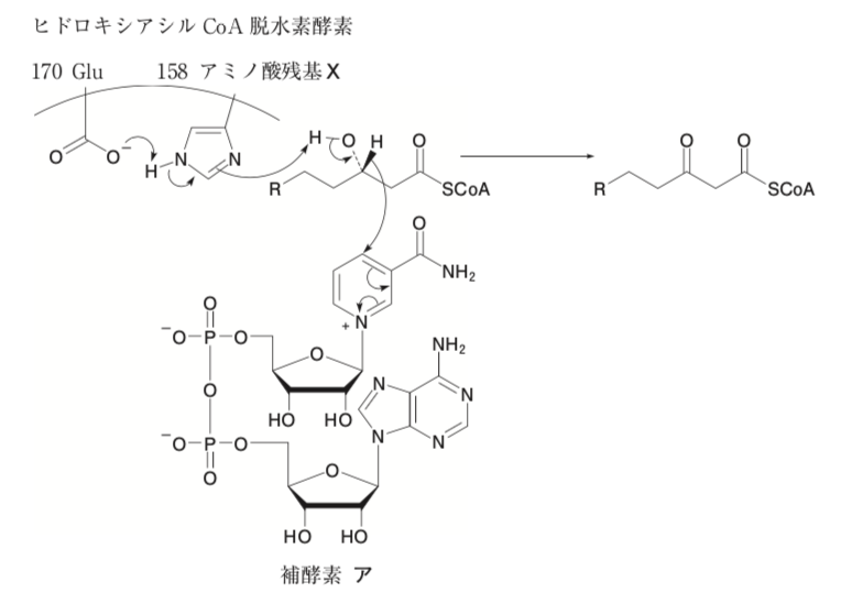 - ヒドロキシアシルCoA脱水素酵素の図中の170番のグルタミン酸残基は、158番のアミノ酸残基Xの側鎖のイミダゾリル基の塩基性を高めている。