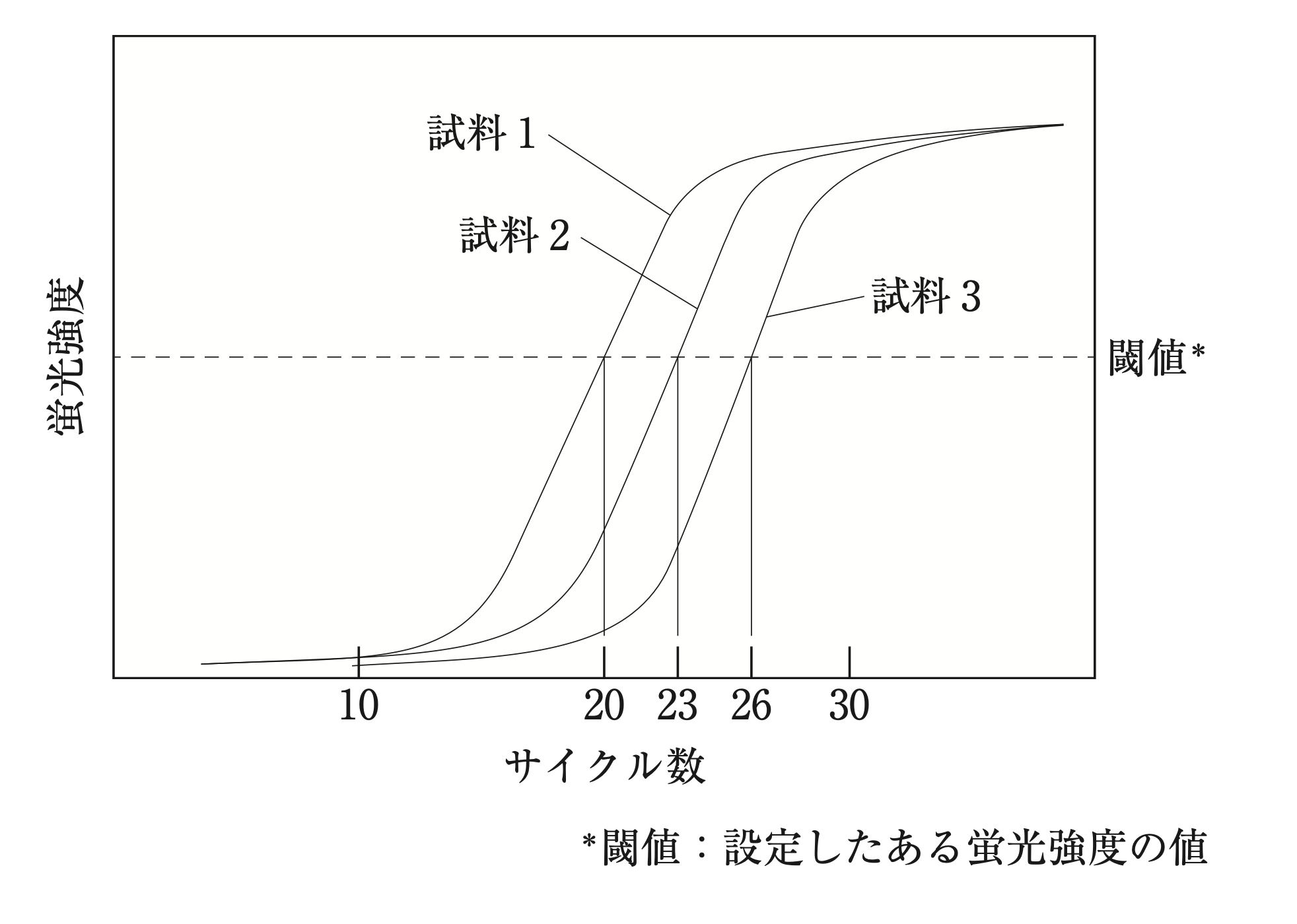 3つの検体(試料1~3)をサンプルチューブに別々に採取し、それぞれにDNA抽出用の試薬を加える。→抽出したDNAを定量する。→各検体から一定量のDNAを別々のチューブに取り、それぞれのチューブに二本鎖DNAを検出する蛍光色素、デオキシヌクレオチド混合物、プライマー1組、 酵素を含む反応液を加えて、PCR を開始する。→蛍光強度を測定することで、反応産物が増幅されていく経過を追いながら、PCRを約40サイクルまで繰り返す。
