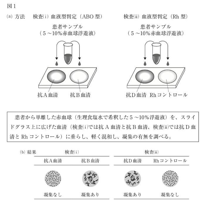 輸血を必要としている患者(幼児)から採血し、単離した赤血球を用いて、図1(a)に示すような血液型判定の検査(ⅰ)、(ⅱ)を行ったところ、結果は図1(b)のようになった。さらに、確認試験として、患者の血清を用いて図2(a)に示す検査(ⅲ)を行った。患者は低ガンマグロブリン症などの疾患は有していない。患者の母親の血液型はA型Rh(-)型である。検査(ⅲ)の結果と、患者の父親の血液型に関する記述のうち、正しいのはどれか。2つ選べ。なお、血液型の遺伝は、メンデルの遺伝の法則に従うものとする。