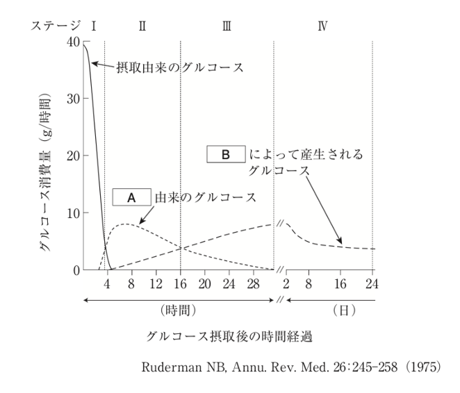 図は、体重 70 kg の男性がグルコース 100 g を摂取後に絶食した場合の血中グルコース濃度に基づいた理論的なグルコース消費量の経時変化を示している。図の縦軸はグルコース消費量を、横軸はグルコース摂取後の時間経過をステージⅠ~Ⅳ に分けて示している。「 A 」及び「 B 」は血中グルコースの供給源を示す。この図に関する記述のうち、誤っているのはどれか。1つ選べ。