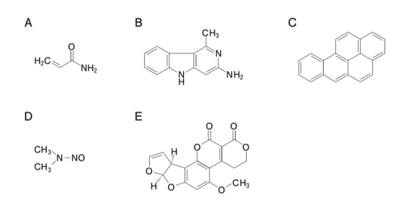 E(アフラトキシンG1)は、Aspergillusflavusが産生する発がん物質である。アフラトキシンG1は、シトクロムP450によるエポキシ化を受け、発がん性を示す。