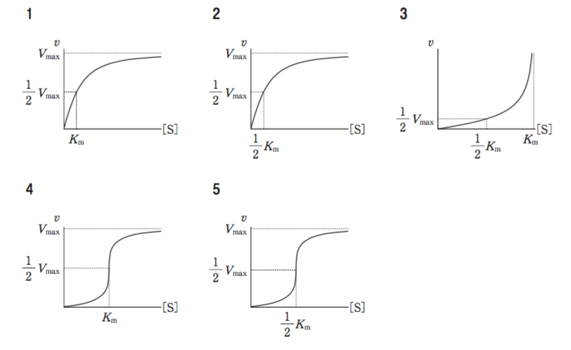 第106回薬剤師国家試験 問14 酵素 2025 1/18 第106回薬剤師国家試験 Michaelis-Mentenの速度論に従う酵素について、至適温度における基質濃度[S]と反応初速度vの関係、及び、この酵素のミカエリス定数Kmと最大反応速度Vmaxを示したグラフとして正しいのはどれか。1つ選べ。 解答・解説 解答 1 解説動画 第106回薬剤師国家試験 よかったらシェアしてね! URLをコピーしました! 第106回薬剤師国家試験 問13 細胞の構造と機能 第106回薬剤師国家試験 問15 微生物 関連記事 第106回薬剤師国家試験 問244〜245(実践問題) 飲料水の水質検査 2023年2月17日 第106回薬剤師国家試験 問242〜243(実践問題) PET/CT 2023年2月17日 第106回薬剤師国家試験 問240〜241(実践問題) 特定保健用食品 2023年2月17日 第106回薬剤師国家試験 問238〜239(実践問題) 遺伝子的検査 2023年2月17日 第106回薬剤師国家試験 問105(理論問題) バイオアイソスター 2023年2月17日 第106回薬剤師国家試験 問104(理論問題) シメチジンの合成反応 2023年2月17日 第106回薬剤師国家試験 問102(理論問題) 酸・塩基の強弱 2023年2月17日 第106回薬剤師国家試験 問101(理論問題) ビタミンB12 2023年2月17日 コメント コメントする コメントをキャンセルコメント ※ 名前 メール サイト
