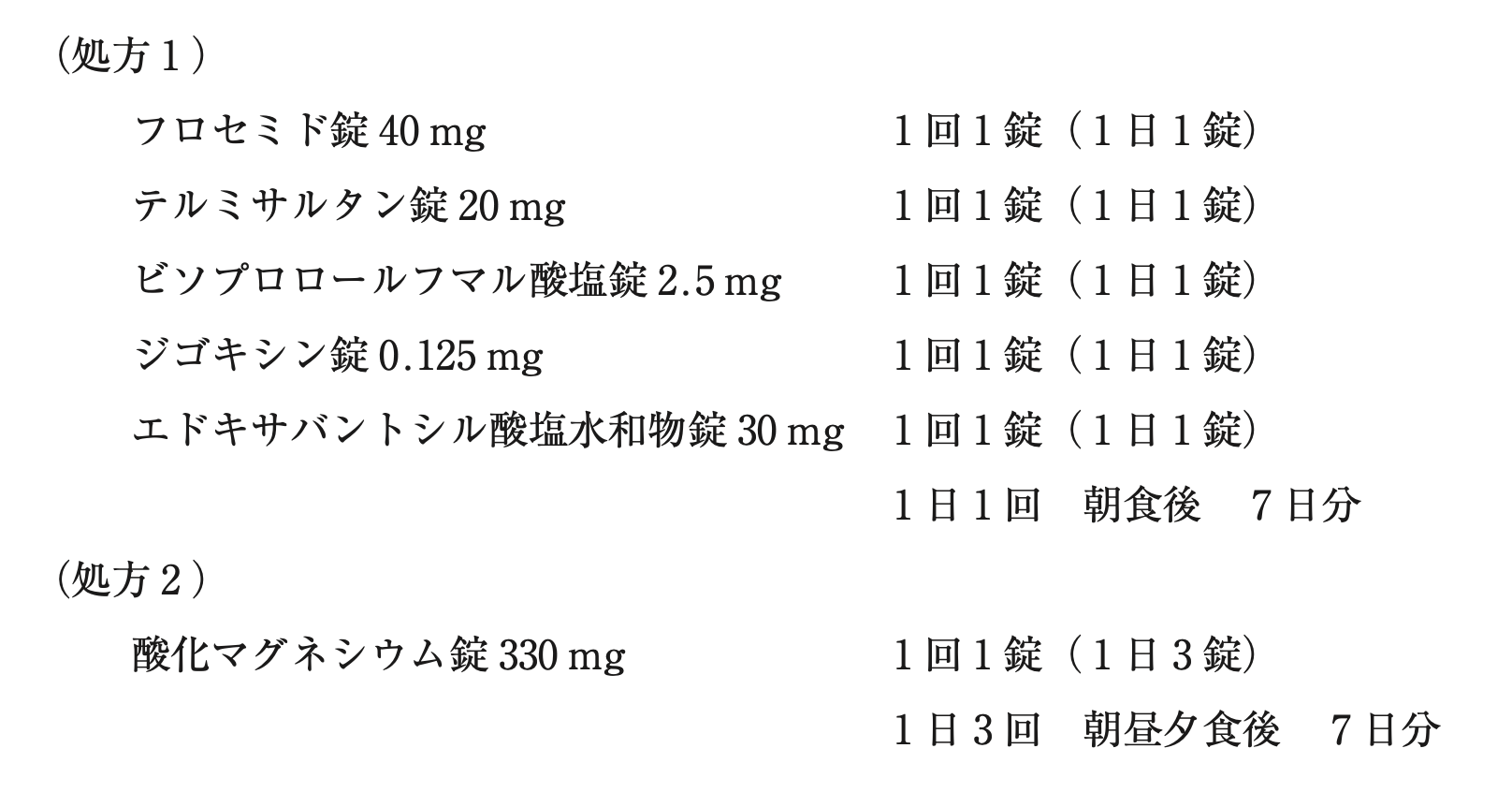 76歳男性。体重50 kg。高血圧と心不全により入院となり、処方1が開始となった。入院時のeGFRは23.9 mL/min/1.73 m2 であったが、尿量が増加し浮腫も徐々に改善して、状態も安定してきた。1週間後、便秘に対し処方2が開始となった。さらに1週間後、血清カリウム値が5.6mEq/Lと上昇したため、経口ゼリー剤Aを追加した。