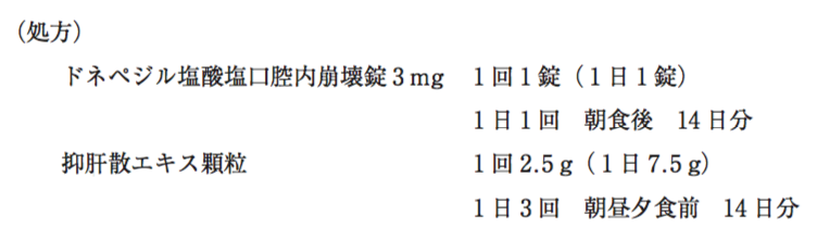 70歳男性。 1年前に妻ががんで死亡し、娘夫婦と同居している。半年前から、元気がなく、物忘れをすることがあった。最近、「妻が私の隣に座って話しかけてくることがある」、「自分は邪魔にされている」、「娘の子供が私のお金を盗む」 などの発言をするようになったので、娘に付き添われて病院を受診した。レビー小体型認知症と診断され、以下の処方箋を持って薬局を訪れた。