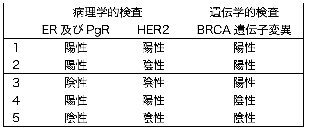46歳女性。職場の検診で乳がんを疑われ、精密検査を受けるため大学病院を受診した。病変部の組織診(針生検)を行い、エストロゲン受容体(ER)、プロゲステロン受容体(PgR)及びHER2(ヒト上皮増殖因子受容体2型)のタンパク質発現を病理学的検査により調べた。また、リンパ節や全身への転移の有無をCT検査にて確認し、StageⅡBの乳がんと確定診断された。その結果に基づき、術前化学療法としてEC療法※、次にパクリタキセル療法を実施した。その後、乳房温存術を施行、内分泌療法は行わず経過観察としていたが、翌年再発が判明したため、遺伝学的検査(BRCA遺伝子変異)をし、その結果、オラパリブを投与することとなった。