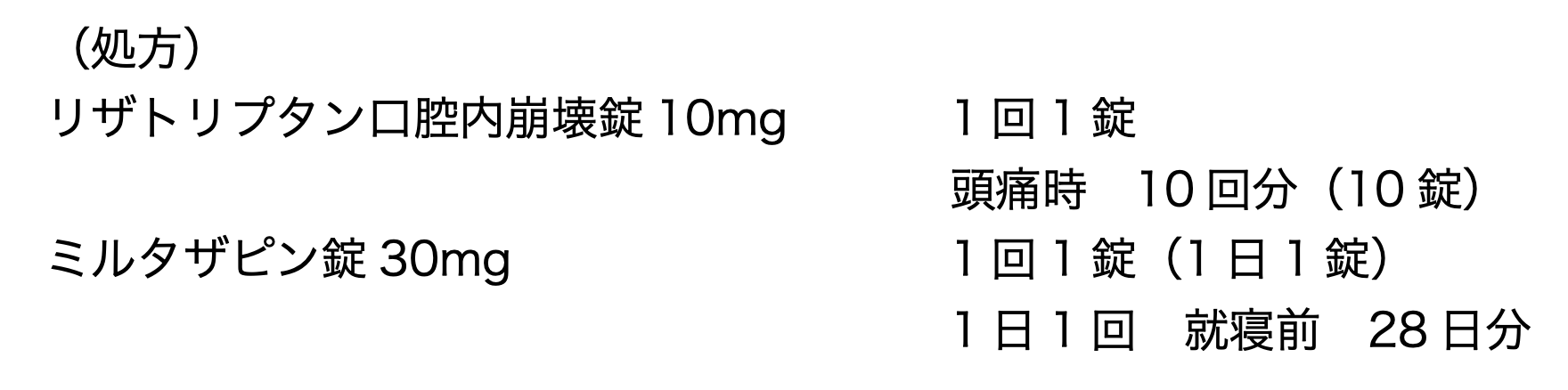 62歳女性。身長152 cm、体重41 kg。片頭痛と抑うつに対して次の処方が出されていた。