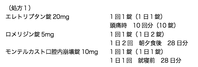 35 歳女性。身長 160 cm、体重 48 kg。学生時代より重度の花粉症のため、投薬治療を受けていた。1年ほど前より片頭痛が徐々に強くなり、かかりつけ医を受診して以下の処方1で治療を受けている。