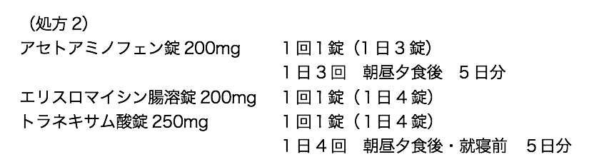 帰宅後に発熱、倦怠感、喉の痛みを自覚し、近医を受診した。急性扁桃炎と診断され、処方2が処方された。