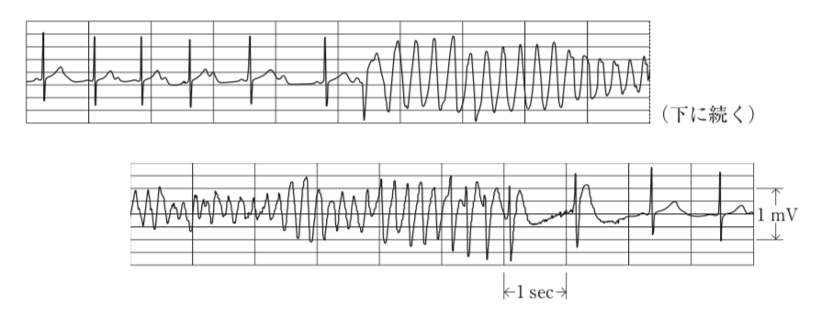 意識消失時に心電図モニターに異常波形(下図)を認め、その際脈拍を触知しなかった。非発作時は意識清明で、心音や呼吸音に異常はない。