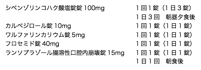 家族から、最近、処方薬が変更になったとの情報を得た。そのため、変更された薬物により意識消失が引き起こされた可能性があると考えた。現在、患者は以下の薬剤を服用している。最も疑わしいのはどれか。1つ選べ。