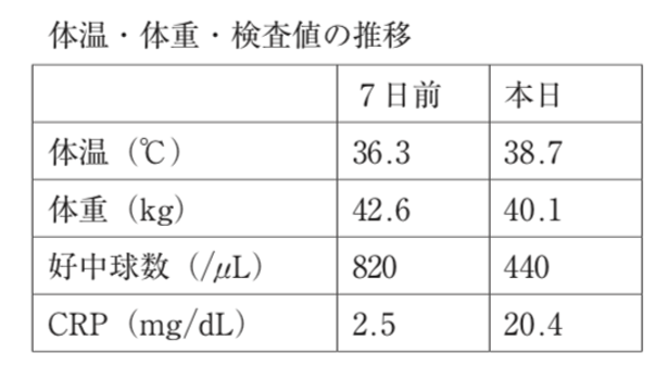 67歳女性。身長160 cm。10年前に右乳がんに対し乳房切除術を施行した。術後3年で骨転移し、経年的に肝、肺にも転移した。骨転移が見つかってから、全身化学療法を実施し、現在はエリブリンによる七次治療中である。7日前にエリブリンの5サイクル目(1サイクル:day1とday8投与、day15休薬)のday1の投与を行った。その後、倦怠感の出現、食欲の低下、歩行困難の進行が認められ、本日、入院となった。疼痛の訴えはない。7日前と本日の体温、体重、主な検査値は下表のとおりである。