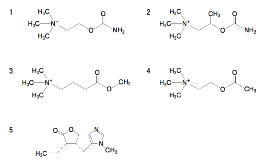 以下の直接型コリン作動薬のうち、コリンエステラーゼにより最も加水分解されやすいのはどれか。1つ選べ。