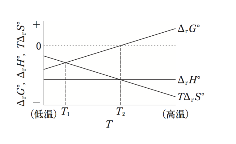 - 温度がT2より低温側では、この反応はエントロピー駆動となる。