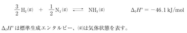 正反応(右向きの反応)は、標準生成エンタルピーが「マイナス」であることから、発熱反応であると判断できる。系の温度を下げると、発熱する方向に反応が進むため、平衡は右側へ移動する。