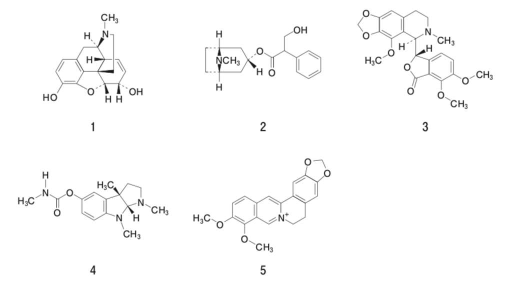 アトロピンの構造であり、オルニチン由来のトロパンアルカロイドである。