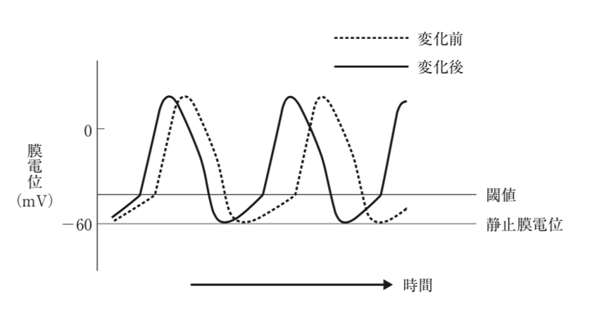 図は、洞房結節細胞の自発性活動電位に対する自律神経の影響を示したものである。以下の記述のうち、正しいのはどれか。2つ選べ。