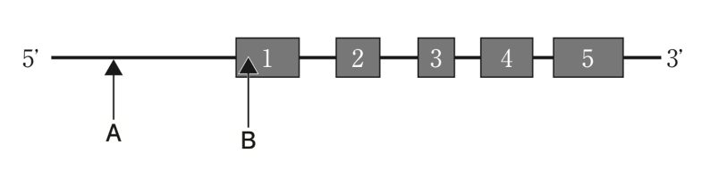 - 多型Bは、逆転写酵素を用い、第2エクソン内の配列に対するRT–PCRで判定できる。
