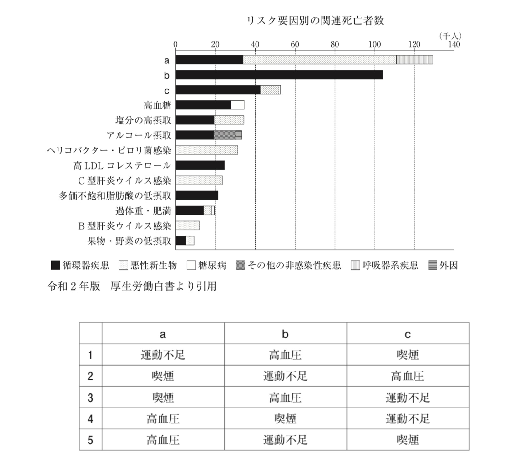 図は、我が国のリスク要因別の関連死亡者数を示したものである。リスク要因a〜cの組合せとして、正しいのはどれか。1つ選べ。