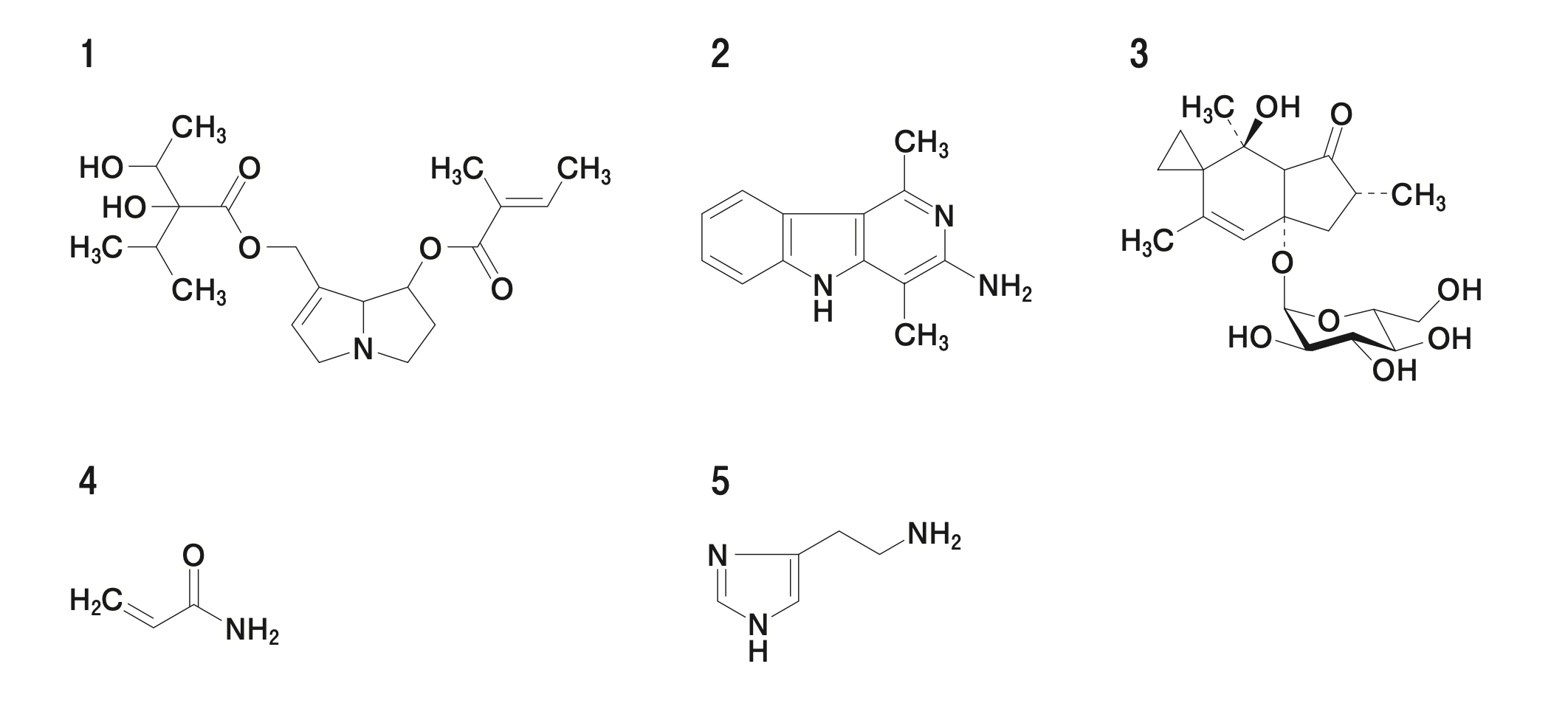 シンフィチンの構造である。シンフィチンはコンフリーに含まれるピロリジジンアルカロイドであり、肝障害を引き起こすことがある。
