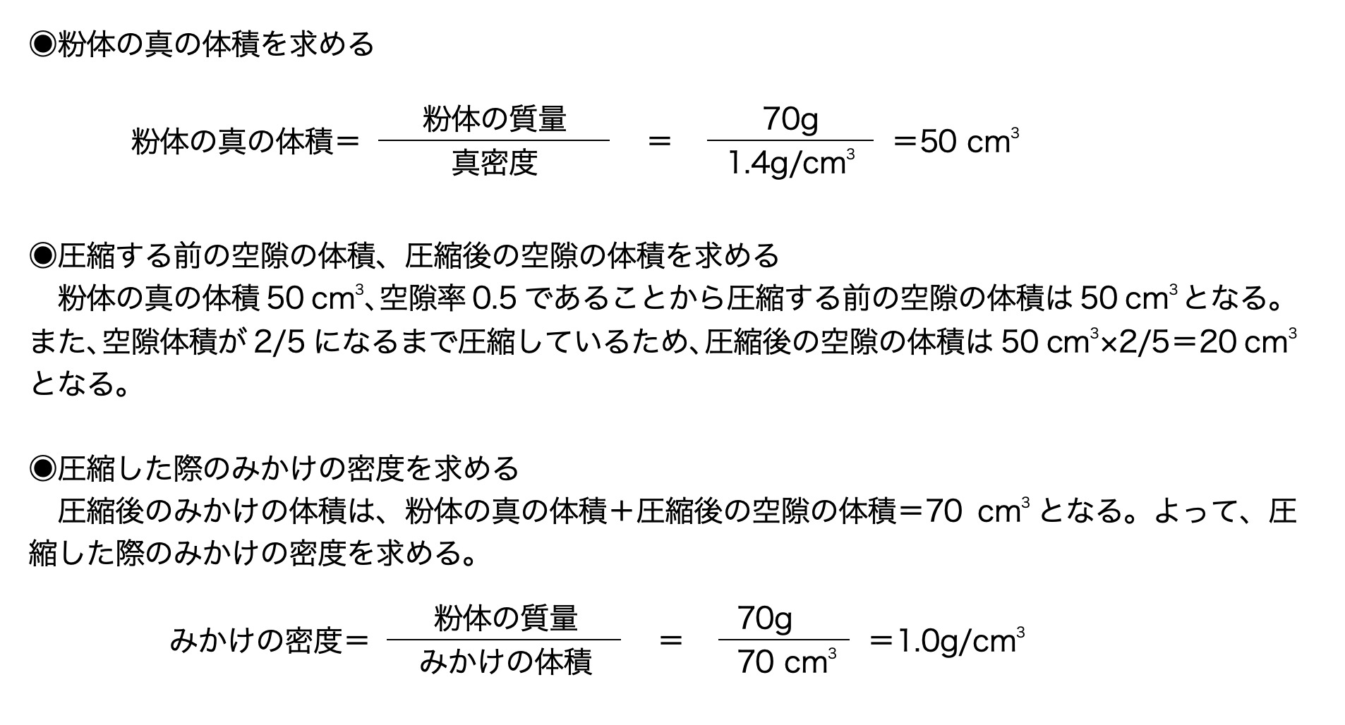 - 真密度1.4g/cm3、空隙率0.5の粉末70gの空隙体積が2/5になるまで圧縮した際のみかけの密度は1.0g/cm3である。