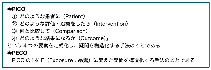 - PICO又はPECOと呼ばれる4つの要素(Patient、Intervention/Exposure、Comparison、Outcome)を用いて問題の定式化を行う。