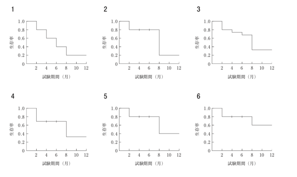 試験期間12ヶ月の臨床試験に参加した5名の被験者の経過をもとにカプランマイヤー生存曲線を記載すると「選択肢3」のようになる。