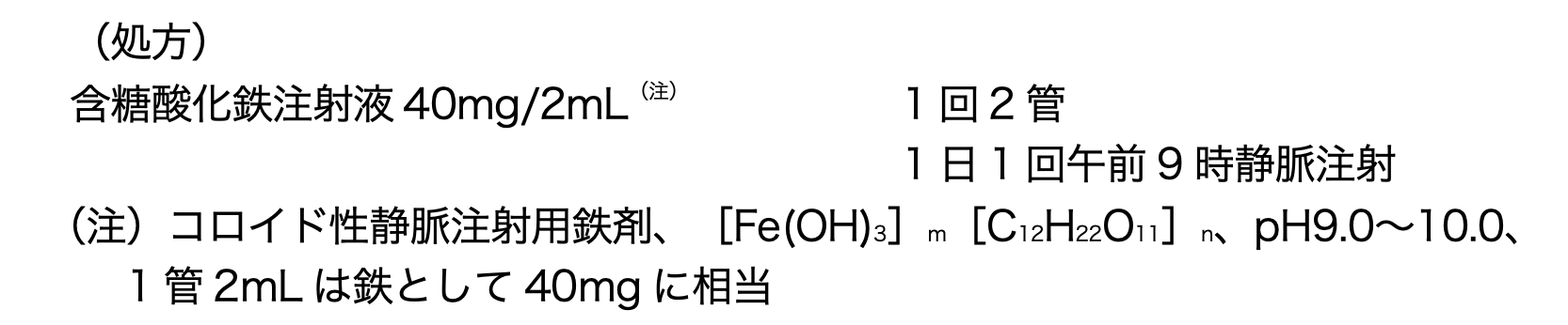 - 疎水コロイドを形成する水酸化鉄(III)を糖で安定化させた鉄剤である。