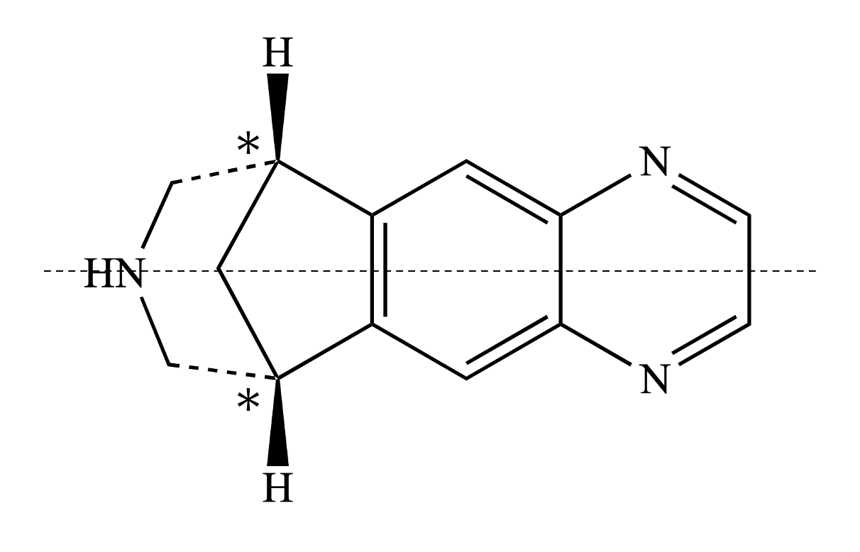 バレニクリンは、キラル炭素を有するが、分子内対称面を有するため、アキラルな化合物であり、鏡像異性体は存在しない。