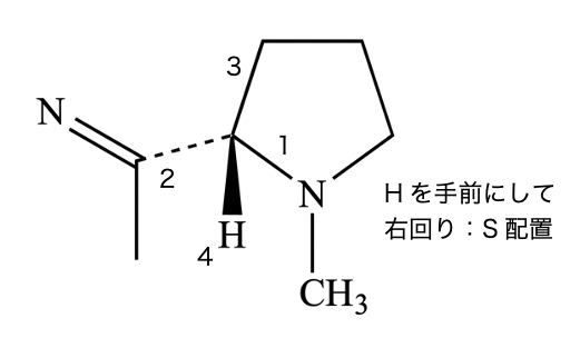 ニコチンの不斉炭素はS配置である。