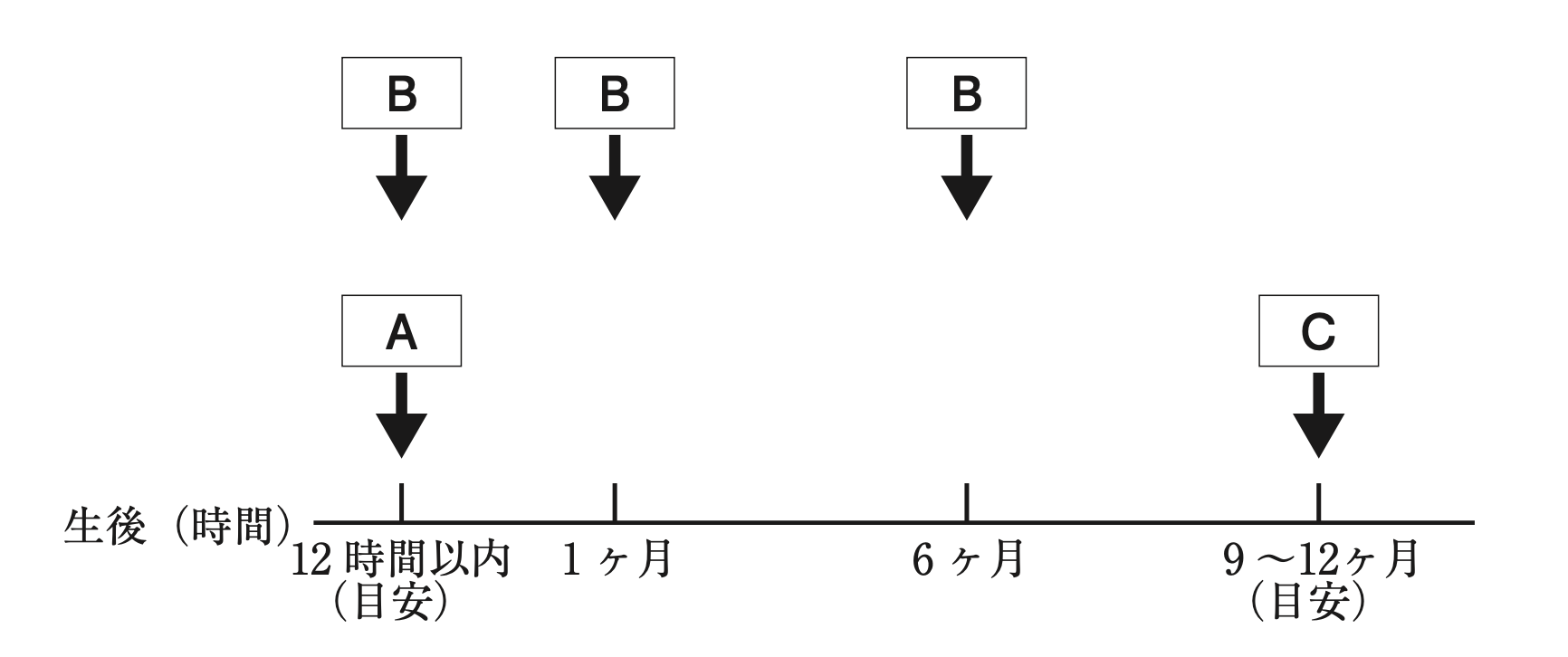 この妊婦から出生した児に対して行うB型肝炎ウイルス感染に関する予防処置を時系列で示した(A〜C)。正しい組合せはどれか。1つ選べ。