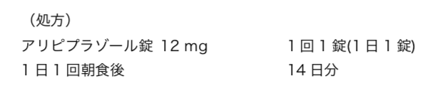 23歳女性。半年前に幻覚と妄想が出現し統合失調症と診断され、リスペリドン6mgによる治療を受けていた。精神症状は改善したが、手のふるえや筋肉が突っ張るような錐体外路症状が出現した。また、これまで規則正しかった月経が止まったとの訴えがあり、検査により高プロラクチン血症と診断された。患者から別の薬剤への変更を希望され、以下の処方へ変更することになった。
