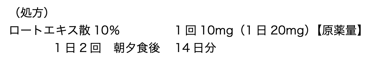 ロートエキス散10%には1g中に100mgの有効成分が含まれており、1回の製剤量は10mg÷100mg