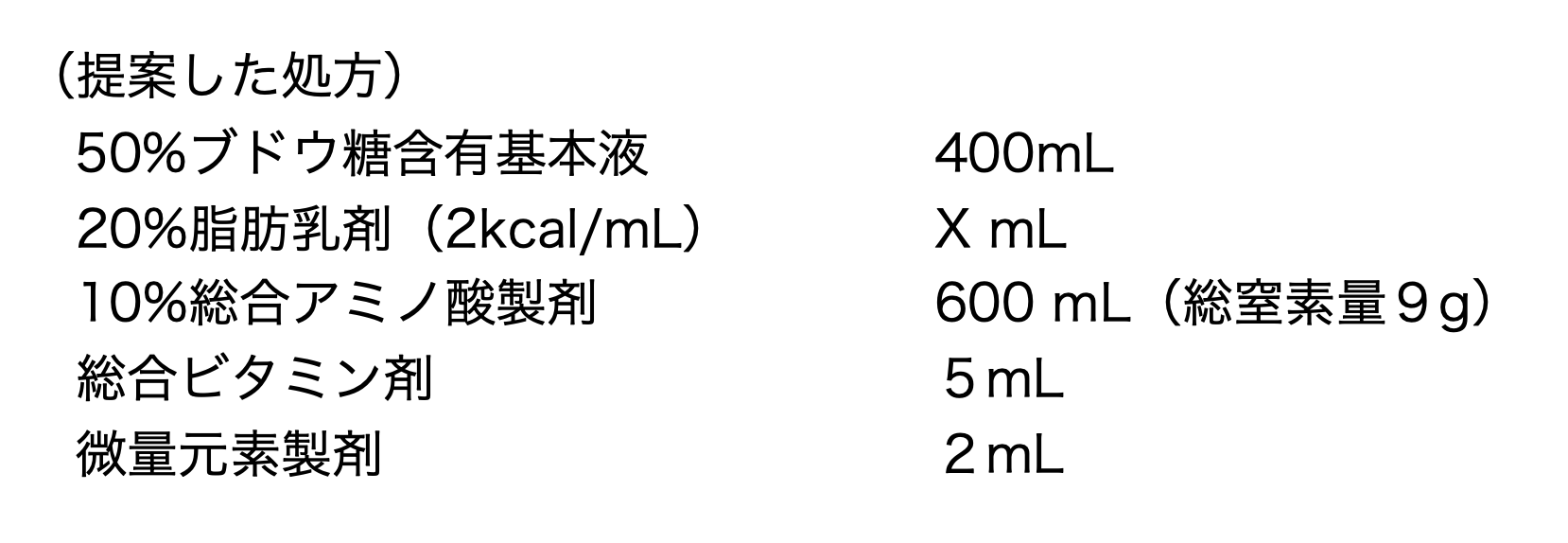 65歳男性。意識障害により経口摂取困難となったため、非経口投与による栄養管理を開始することになった。主治医より高カロリー輸液の処方設計の依頼があり、以下の処方提案をした。この高カロリー輸液の非タンパク質カロリー/窒素量(NPC/N)を150にするための脂肪乳剤の液量Xに最も近い値はどれか。1つ選べ。