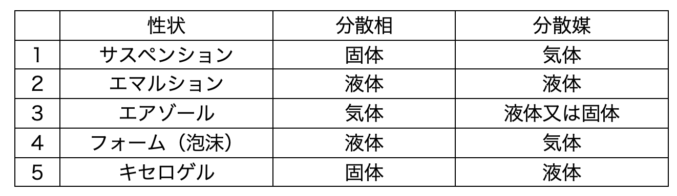 分散系における分散相と分散媒の組合せのうち、正しいのはどれか。1つ選べ。