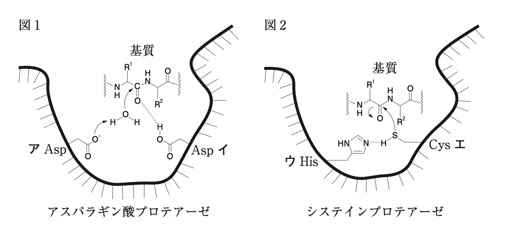 図1及び図2は、アスパラギン酸プロテアーゼ及びシステインプロテアーゼによる基質加水分解の初期反応過程の模式図である。以下の記述のうち、正しいのはどれか。2つ選べ。