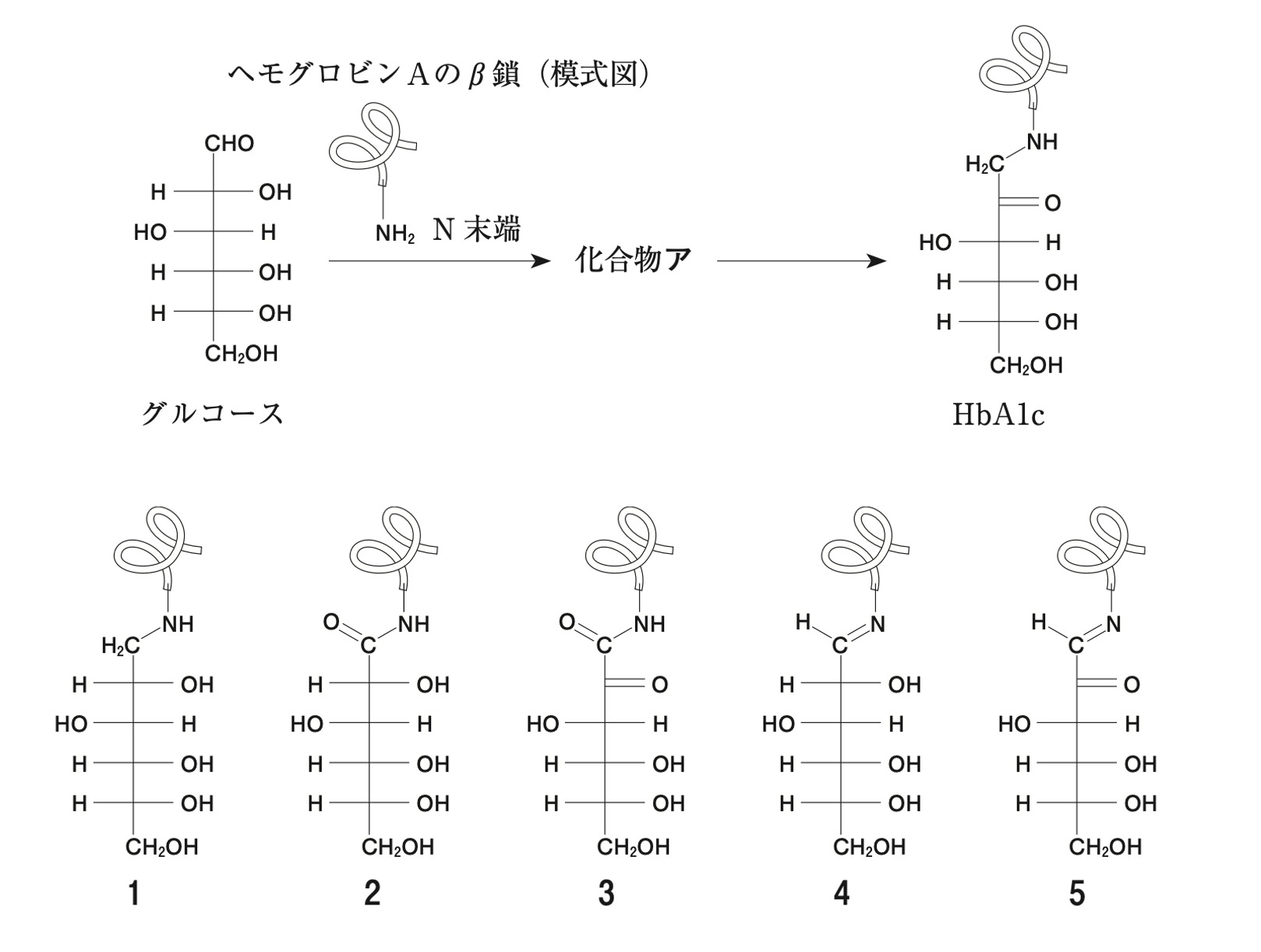 グルコースはヘモグロビンAのβ鎖N末端のアミノ基と反応し、化合物アを与えたのち、HbA1cとなる。化合物アの構造として最も適切なのはどれか。1つ選べ。