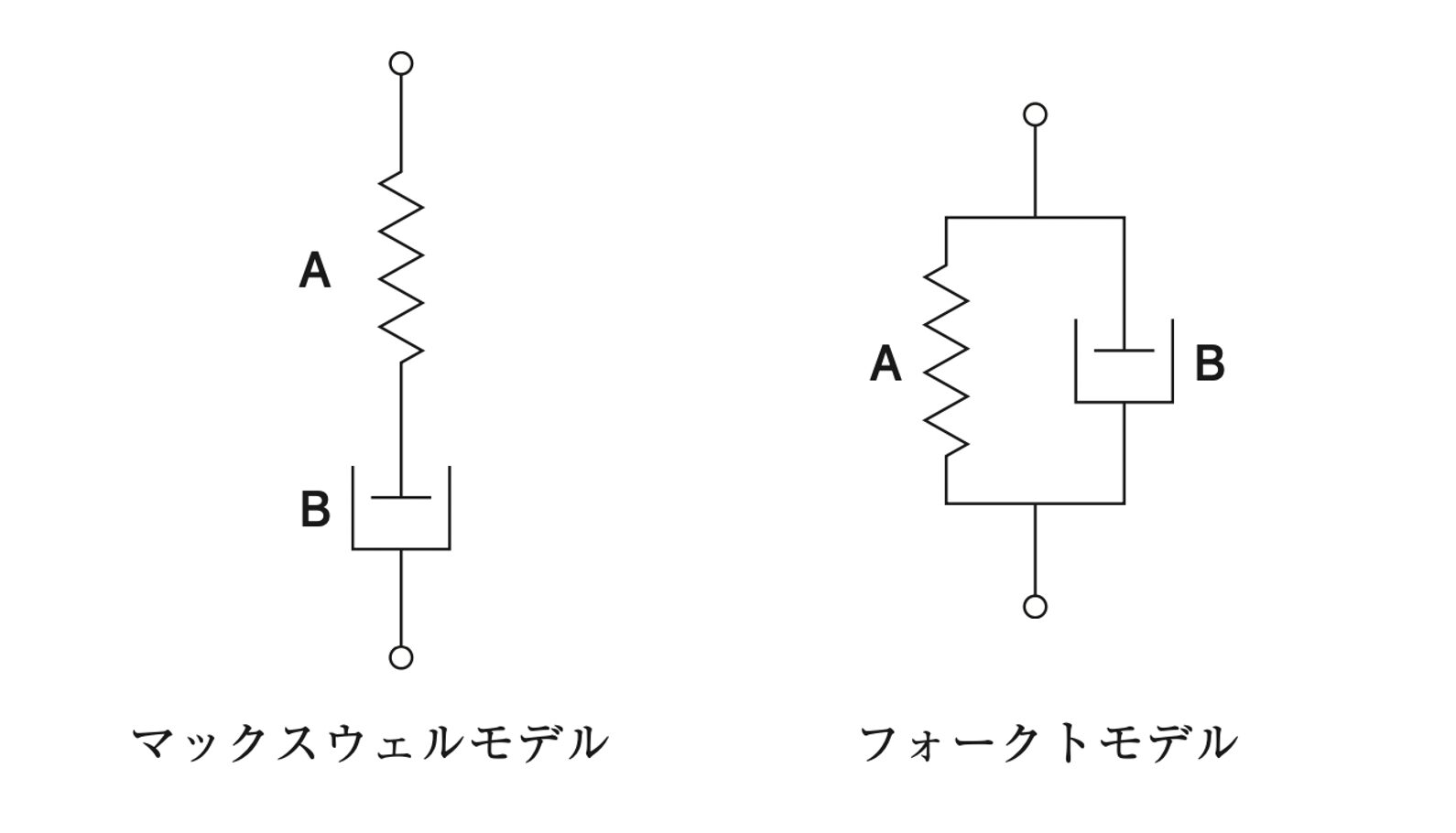 - Aのスプリングは弾性体のモデル、Bのダッシュポットは粘性体のモデルである。