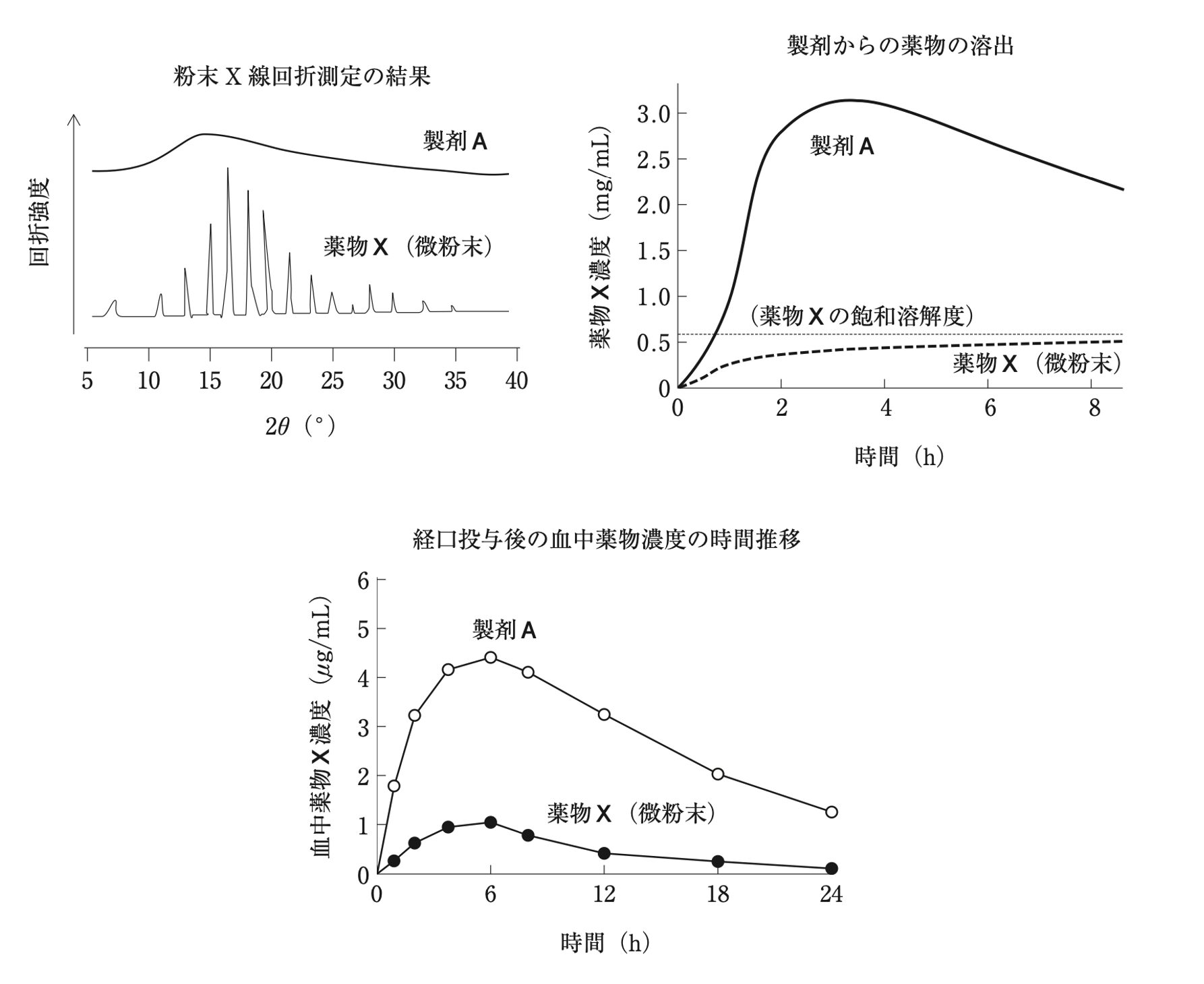 BCS(Biopharmaceutics classification system)分類とは、薬物を溶解性と膜透過性に基づいて4つに分類したものである。溶解性は低いが膜透過性が高いClass2の薬物Xを含有する経口固形製剤Aについて、以下のデータが得られている。製剤Aにおける吸収改善の機構と最も関連の深いのはどれか。1つ選べ。ただし、薬物Xとしての経口投与量は同一とする。
